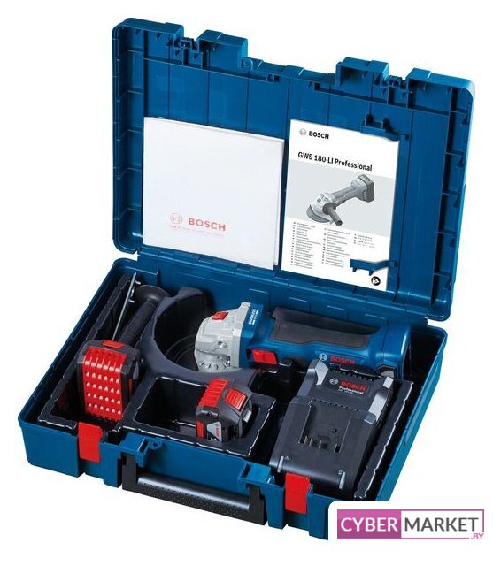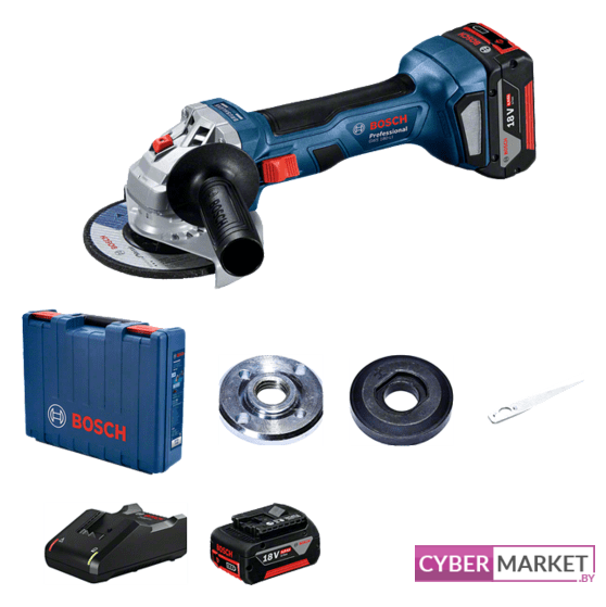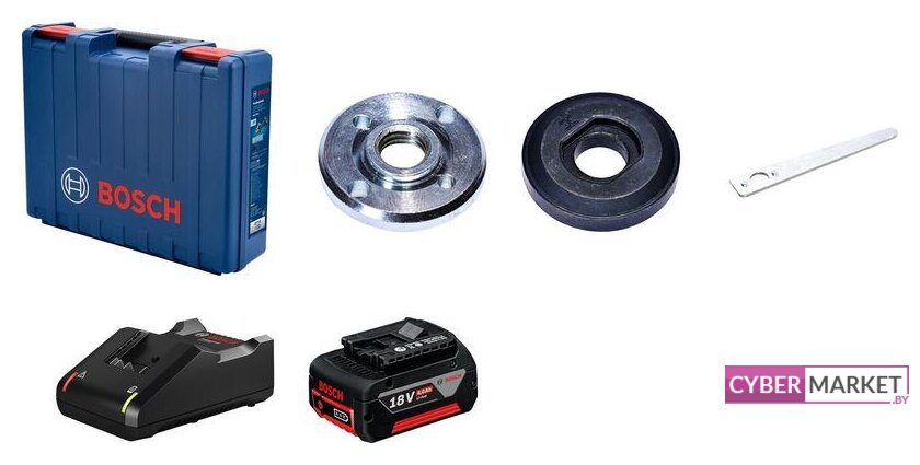 | Комплект поставки | - Опорный фланец- Зажимная гайка- Ключ под два отверстия- Дополнительная рукоятка - Защитный кожух- Быстрозарядное устройство GAL 18V-40 Professional- Чемоданчик- 2 аккумулятора GBA 18V 4.0Ah |