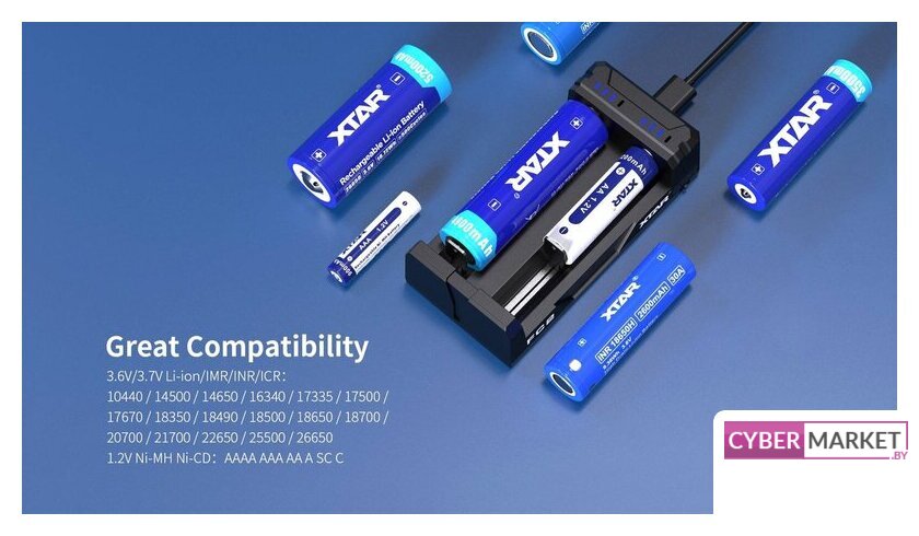 | Типоразмер | AA, AAA, 18650, 10440, 14500, 14650, 16340, 17335, 17500, 17670, 18350, 18490, 18500, 18700, 20700, 21700, 22650, 25500, 26650, A, AAAA, C, SC |