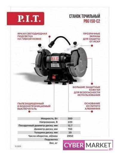 | Комплект поставки | - Станок точильный, - круг шлифовальный (2 шт), - защитный экран с креплением (2 шт), - рабочая площадка с креплением (2 шт), - коробка, - инструкция по эксплуатации. |