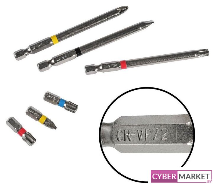 | Размер биты | H4, H5, H6, PH1, PH2, PH3, PZ1, PZ2, PZ3, SL4, SL6, T10, T15, T20, T25, T27, T30, T40, TH10, TH15, TH20, TH25, TH30, TH40 |