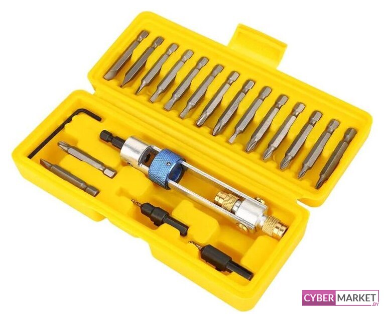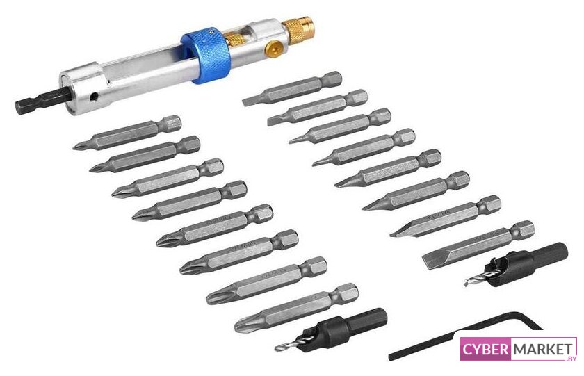 | Комплектация | 1 шт - насадка-твистер8 шт - биты Phillips: PH0 - 2шт, PH1 - 2шт, PH2 - шт, PH3 - шт8 шт - биты Slotted: 1/8'' 3.2мм - 2шт, 5/32''4мм - 2шт, 3/16''4.8мм - 2шт, 1/4''6.3мм - 2шт2 шт - сверла: 3/32''2.4мм, 1/8''3.2мм1 шт - шестигранный ключКейс |