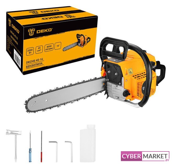 | Комплект поставки | - Бензопила в частично разобранном виде (корпус двигателя – 1шт, шина – 1шт, цепь – 1шт, защитный щиток – 1шт, упор зубчатый (гребенка) – 1шт, саморезы – 2шт) - 1 шт.- Ключ свечи зажигания - 1 шт.- Отвертка для регулировки карбюратора - 1 шт.- Шестигранные ключи - 2 шт.- Напильник - 1 шт.- Емкость для приготовления топливной смеси - 1 шт.- Руководство по эксплуатации - 1 шт. |