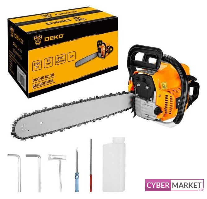 | Комплект поставки | - Бензопила в частично разобранном виде (корпус двигателя – 1шт, шина – 1шт, цепь – 1шт, защитный щиток – 1шт, упор зубчатый (гребенка) – 1шт, саморезы – 2шт) - 1 шт.- Ключ свечи зажигания - 1 шт.- Отвертка для регулировки карбюратора - 1 шт.- Шестигранные ключи - 2 шт.- Напильник - 1 шт.- Емкость для приготовления топливной смеси - 1 шт.- Руководство по эксплуатации - 1 шт. |