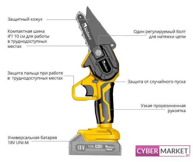 аккумуляторная, бытовая, 20 В, шаг цепи: 1/4 дюйма, длина шины: 10 см, аккумулятор в комплекте, 1.3 кг