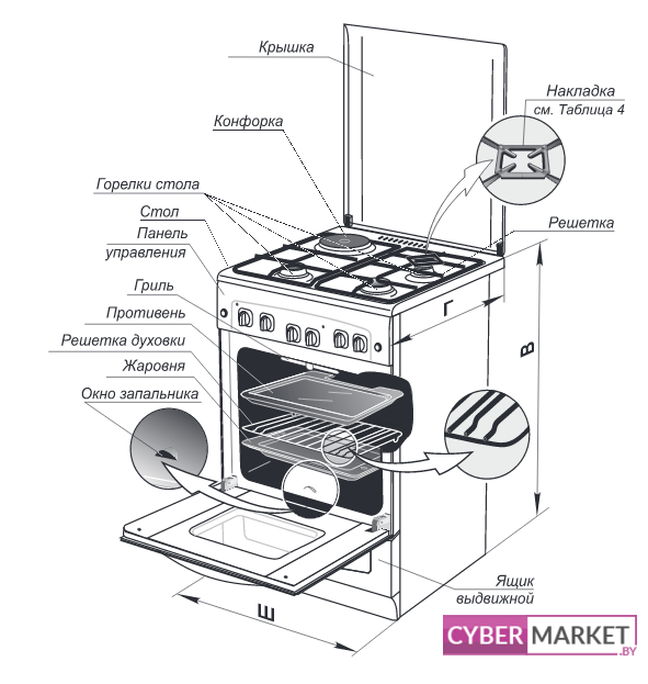 газ+электро панель + газовый духовой шкаф, поверхность: эмалированная сталь, крышка из эмалированной стали, управление механическое, без таймера, размеры (ШхГхВ): 60x60x85 см