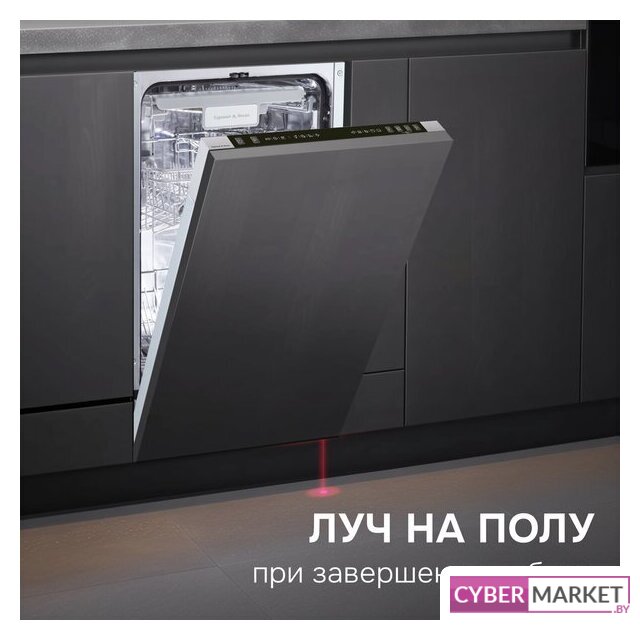 загрузка на 14 комплектов посуды, сенсорное управление, 8 программ, 59.8×55×82 см, черный цвет, сушка: активная конденсация, половинная загрузка, индикация на полу: луч