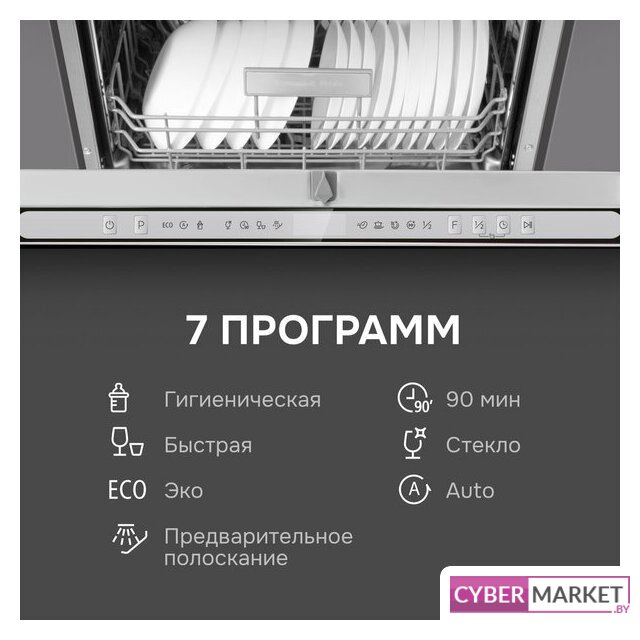 | Дополнительные опции | сокращение времени мойки, дополнительная сушка, усиление интенсивности мойки (гигиеническая мойка), половинная загрузка (экономия воды) |