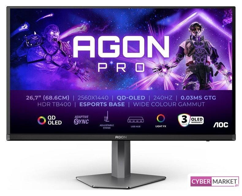 26.5", 2560x1440, 16:9, OLED, 240 Гц, c квантовыми точками, глубина 10 бит, яркость 450 нит, HDMI+DisplayPort, регулировка высоты, портретный режим