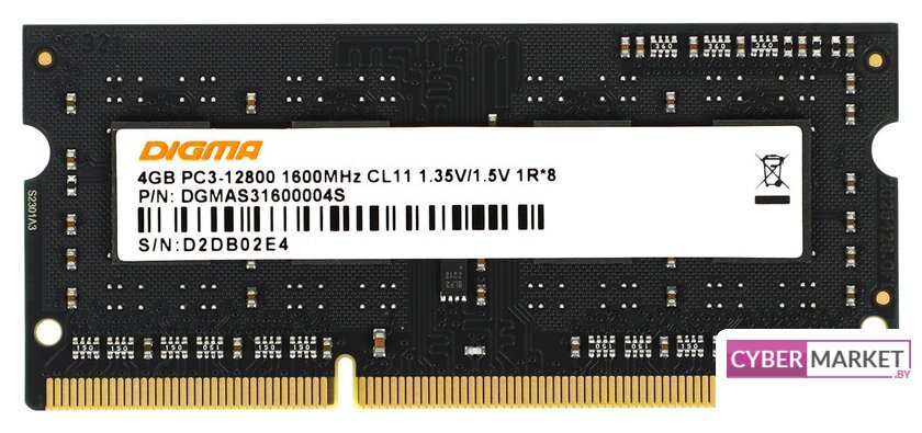 4 ГБ, 1 модуль DDR3 SO-DIMM, частота 1600 МГц, CL 11T, напряжение 1.35 В