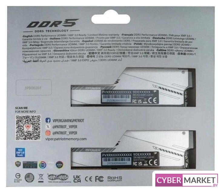 32 ГБ, 1 модуль DDR5 DIMM, частота 6000 МГц, CL 30T, тайминги 30-36-36, напряжение 1.4 В
