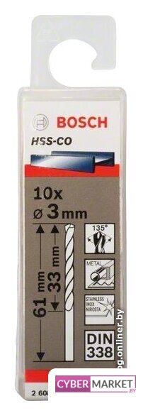 | Комплектация | Свёрла по металлу HSS-Co , DIN 338:Диаметр (D), мм - 3.0Рабочая длина (L1), мм - 33Общая длина (L2), мм - 61 |