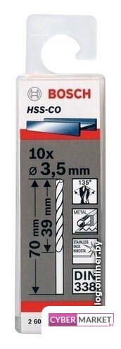 | Комплектация | Свёрла по металлу HSS-Co , DIN 338Диаметр (D) - 3.5ммРабочая длина (L1) - 39.0ммОбщая длина (L2) - 70.0мм |