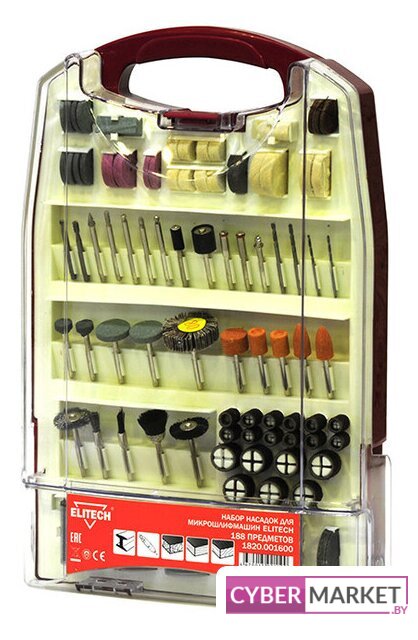| Комплектация | Оправка для шлифовальных колец - 2 шт.; Оправка для полировального круга - 1 шт.; Оправка для отрезного круга - 2 шт.; Абразивное шлифовальное кольцо (большое) - 7 шт.; Абразивное шлифовальное кольцо (малое) - 12 шт.; Цанга - 4 шт.; Абразивная шарошка 1x3/8 - 1 шт.; Лепестковый круг 3/8x3/4 - 1 шт.; Шлифовальный круг 1/2 - 12 шт.; Шлифовальный круг 1/2х1/2 - 2 шт.; Полировальный круг 1/2x1/4 - 8 шт.; Полировальный круг 1x1/4 - 4 шт.; Конусный полировальный круг - 1 шт.; Абразивная шарошка: 1/4x1/2, 1/2x1/2 - 2 шт.; Фрезерное сверло - 2 шт.; Шарошка шлифовальная - 9 шт.; Кардщетка - 5 шт.; Отрезной абразивный круг 1 мм - 30 шт.; Отрезной абразивный круг 0.8 мм - 36 шт.; Отрезной абразивный круг 0.4 мм - 36 шт.; Полировальная паста - 1 шт.; HSS сверло - 4 шт.; Правильный камень - 1 шт.; Отрезной круг из стекловолокна - 10 шт.; Ключ - 1 шт. |
