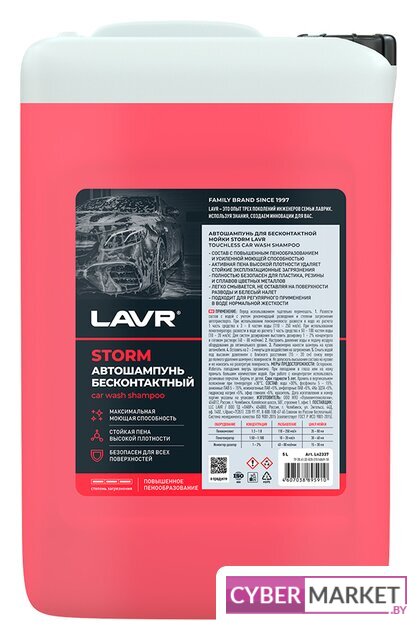 | Способ применения | Перед использованием тщательно перемешатьВ соответствии с рекомендациями производителя оборудования, настроить давление воды и подачу воздуха до оптимального уровня. Допускается применение на пенных и эмульсионных программахДозировка средства в каждом конкретном случае зависит от оборудования, степени загрязнения автотранспорта, жесткости применяемой воды и температуры воздухаРасход концентрата при использовании пеногенератора: 10 – 20 мл/л, при использовании пенокомплекта: 125 – 200 мл/лВ случае сложных загрязнений предварительно сбить грязь аппаратом высокого давленияРавномерно нанести шампунь на кузов автомобиля снизу-вверхОставить на 2 – 3 минуты для воздействия на загрязненияСмыть водой до полного удаления шампуня с поверхностиНе допускать высыхания состава на кузове автомобиля и не наносить на разогретую поверхность |