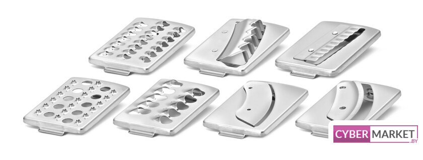 | Полная комплектация | Шинковка крупная Шинковка мелкая Терка крупная Терка мелкая Терка для драников Терка для картофеля фри Терка для фигурной нарезки овощей и фруктов Насадка для смешивания Нож измельчитель Насадка эмульгатор |