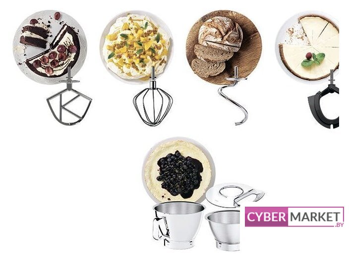 | Полная комплектация | венчик, крюк для теста, К-образная насадка, насадка гибкий-взбиватель, защитная крышка, лопатка, 2 чаши. |