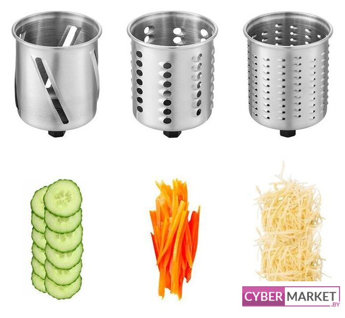 | Полная комплектация | Шинковка подходит для нарезки тонких гладких ломтиков из картофеля, кабачков, капусты, яблок. Крупная тёрка измельчает морковь, перец, сыр, твёрдый сыр. Мелкая тёрка предназначения для измельчения и тёрки сыра, сухарей, орехов и многого другого. |