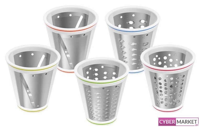 | Полная комплектация | три терки (мелкая, средняя, крупная), два шинковочных ножа, электрическая овощерезка, документация |