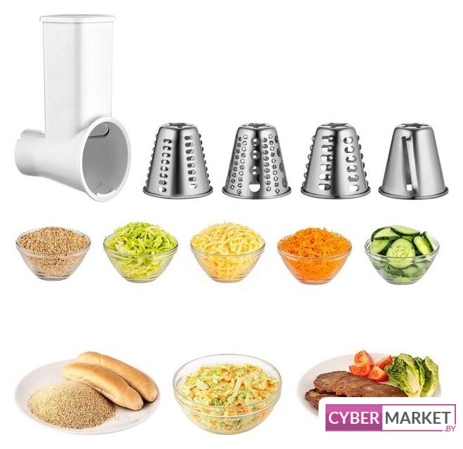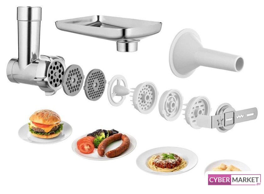 | Функции | мясорубка, блендер, взбивание, смешивание, замешивание дрожжевого теста, терка, шинковка, ломтерезка, драники |