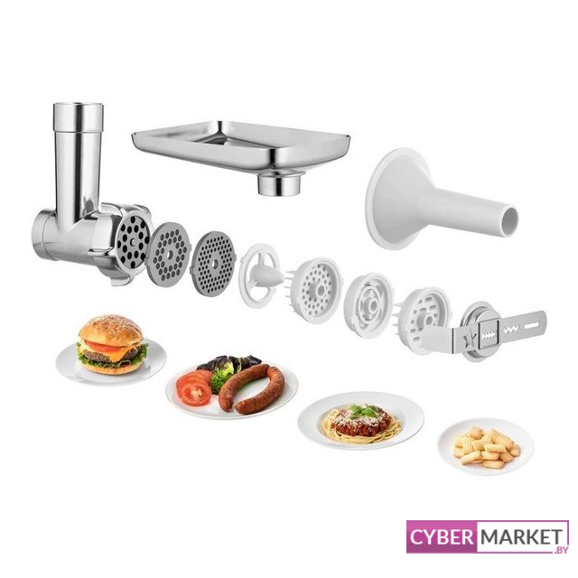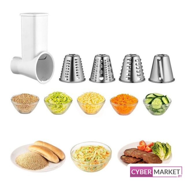 | Функции | мясорубка, блендер, взбивание, смешивание, замешивание дрожжевого теста, терка, шинковка, ломтерезка, драники |