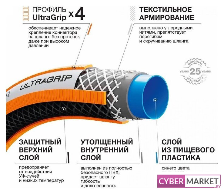 катушка со шлангом с распылителем, ПВХ, армированный, гладкая поверхность, диаметр 13 мм, длина 25 м, оранжевый/серый