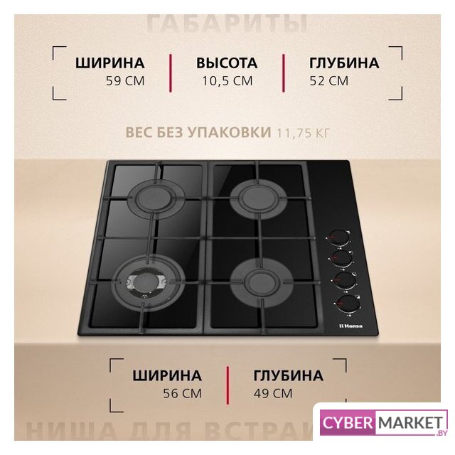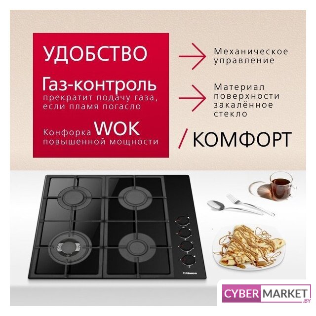 газовая на 4 конфорки, закаленное стекло, мощность: 8000 Вт, автоматический электроподжиг, газ-контроль, решетки: чугун, независимая установка, размеры (ШхГ): 58x50 см