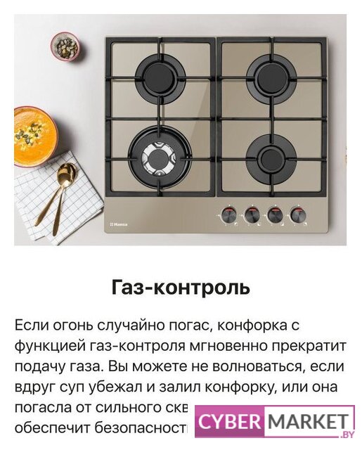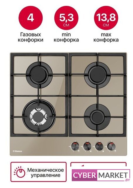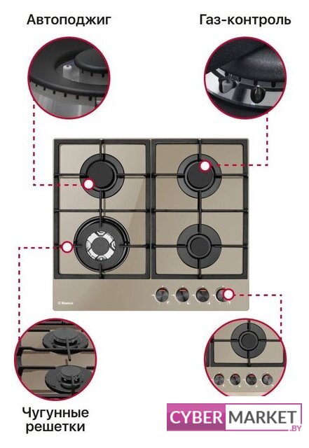 газовая на 4 конфорки, закаленное стекло, мощность: 8800 Вт, автоматический электроподжиг, газ-контроль, решетки: чугун, независимая установка