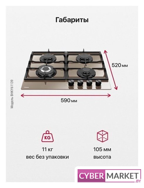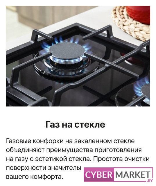 газовая на 4 конфорки, закаленное стекло, мощность: 8800 Вт, автоматический электроподжиг, газ-контроль, решетки: чугун, размеры (ШхГ): 60x52 см