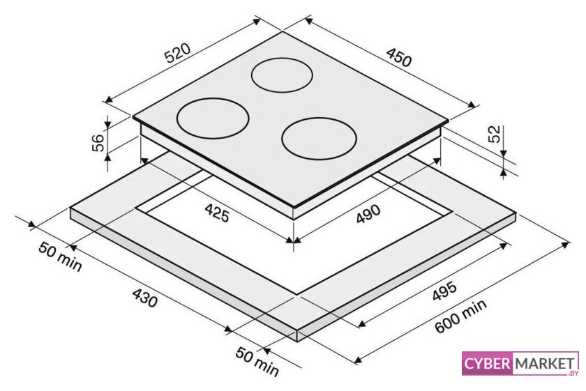 | Подробная информация о конфорках | Дальняя левая: 160 мм * 1,3/1,5 кВт; Ближняя левая: 160 мм * 1,3/1,5 кВт; Центральная правая: 180 мм * 1,8/2,2 кВт |