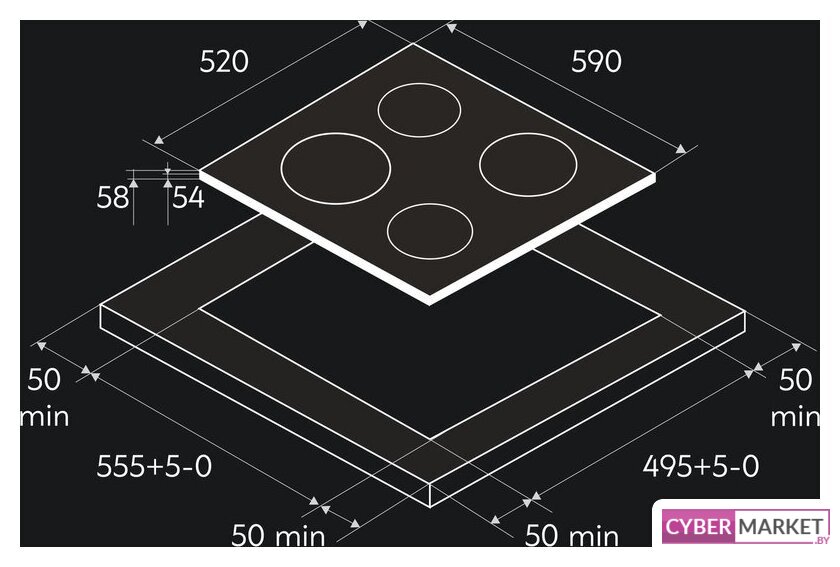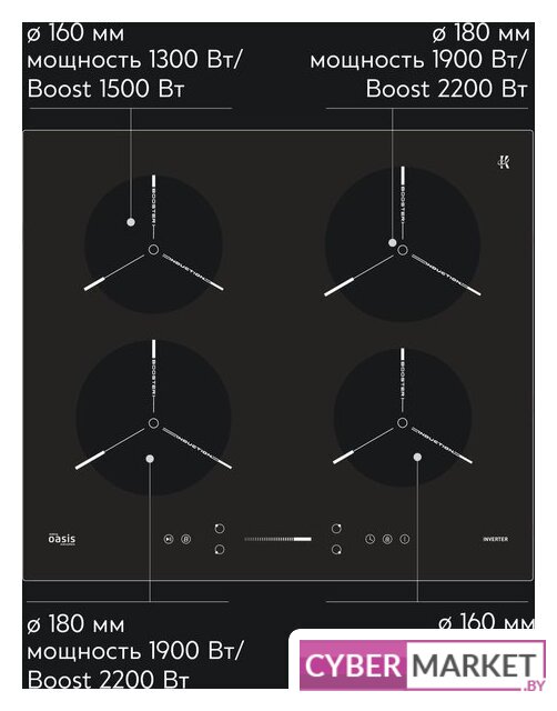 | Подробная информация о конфорках | Ближняя левая – 180 мм/1.9 кВт (booster 2.2 кВт); ближняя правая – 160 мм/1.3 кВт (booster 1.5 кВт); дальняя левая – 160 мм/1.3 кВт (booster 1.5 кВт); дальняя правая – 180 мм/1.9 кВт (booster 2.2 кВт). |