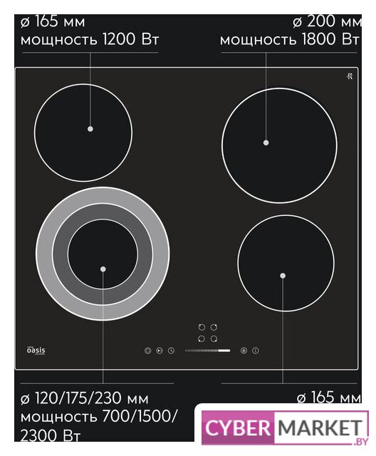 | Подробная информация о конфорках | Ближняя левая:120 мм/0.7 кВт; 175 мм/1.5 кВт; 230 мм/2.3 кВт (тройная зона расширения). Ближняя правая:165 мм/1.2 кВт. Дальняя левая:165 мм/1.2 кВт. Дальняя правая:200 мм/1.8 кВт |