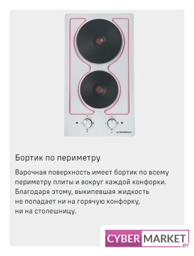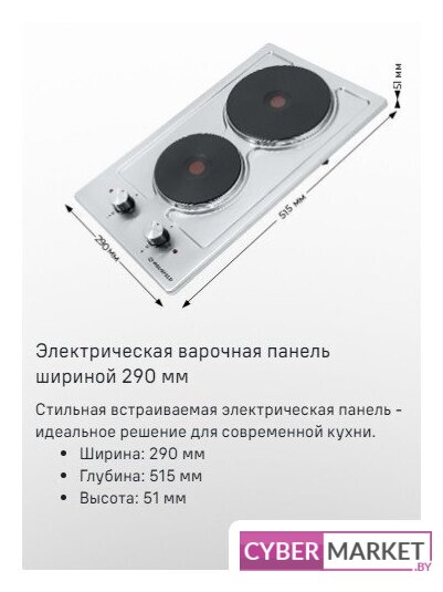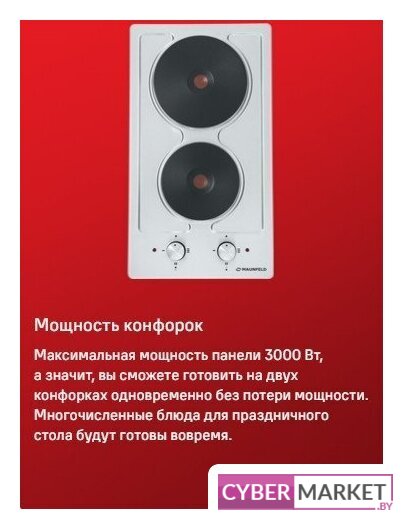 | Подробная информация о конфорках | Мощность конфорок, Вт.: 1500, 1500 |