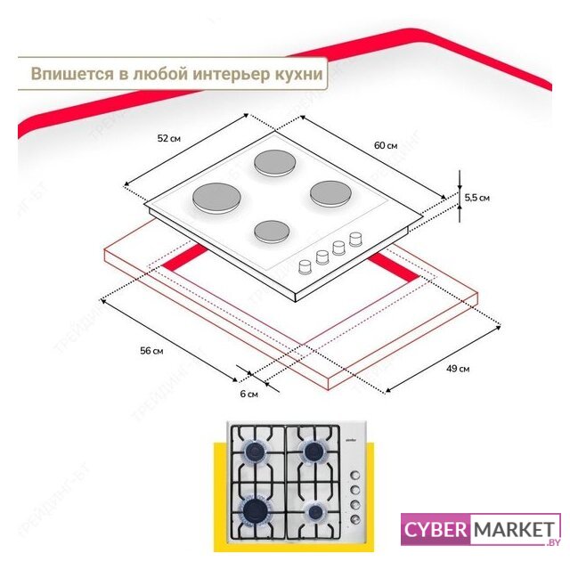 газовая на 2 конфорки, эмалированная сталь, мощность: 4000 Вт, автоматический электроподжиг, газ-контроль, решетки: чугун, независимая установка, размеры (ШхГ): 30x52 см