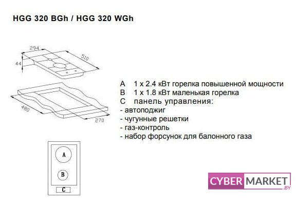 газовая на 2 конфорки, закаленное стекло, мощность: 4300 Вт, автоматический электроподжиг, газ-контроль, решетки: чугун, независимая установка, размеры (ШхГ): 30.5x52 см