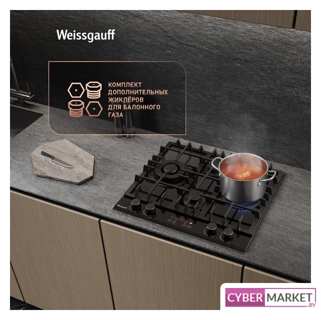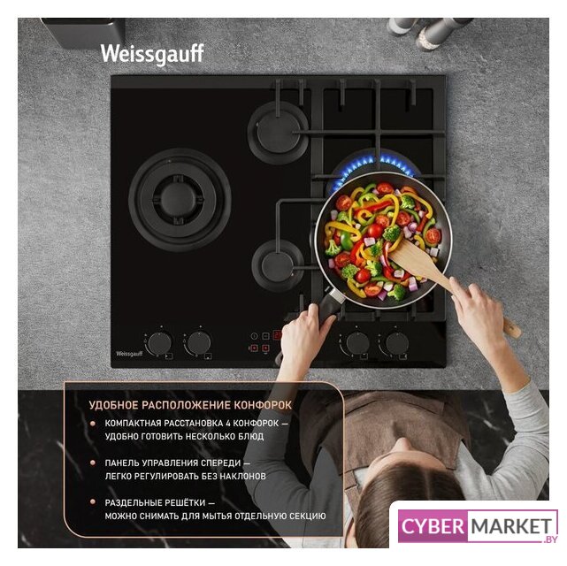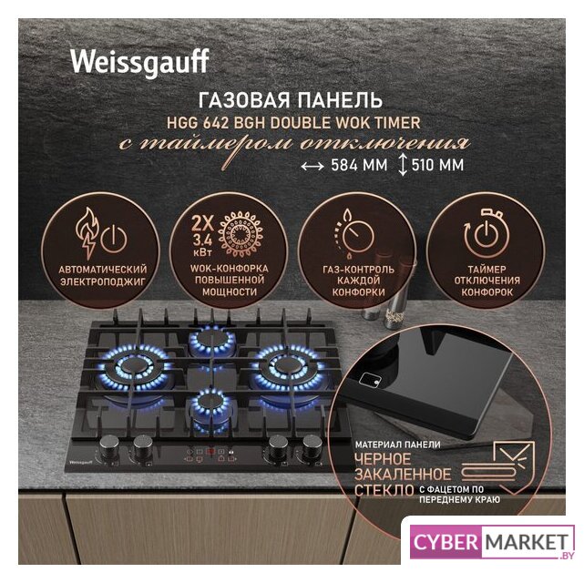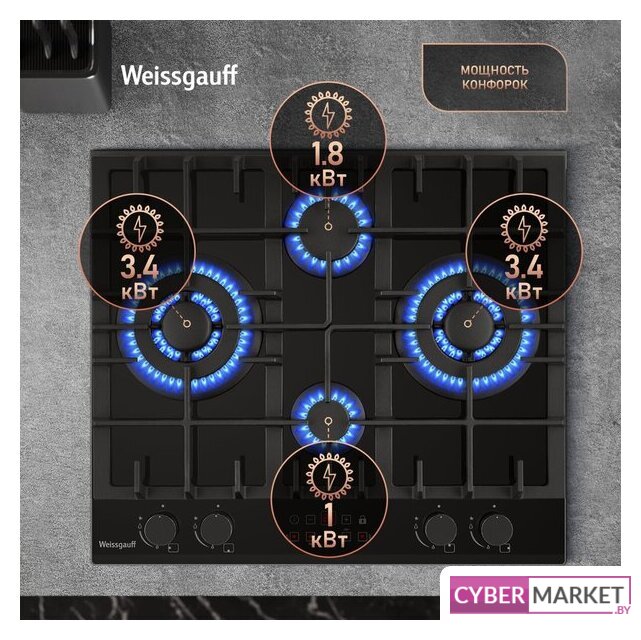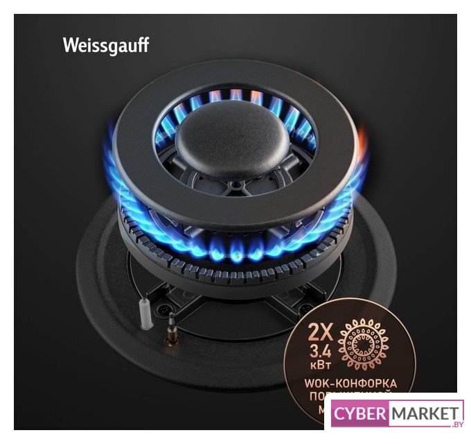 | Подробная информация о конфорках | Две WOK-конфорки мощностью по 3.4 кВт, одна средняя конфорка 1.8 кВт, одна малая конфорка 1.0 кВт |
