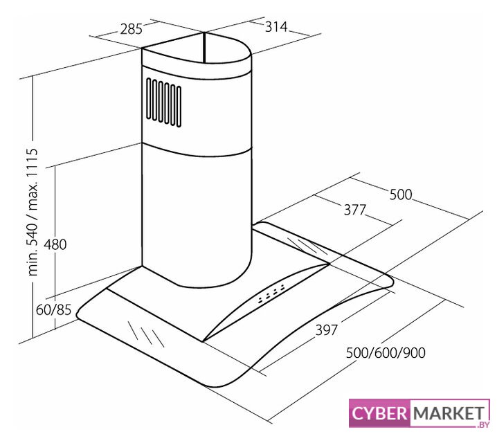 конструкция Т-образная, монтаж настенный, управление электронное/поворотный переключатель, производительность мотора 1200 м³/ч, ширина 59.8 см