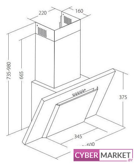 конструкция наклонная, монтаж настенный, ширина 60 см, управление механическое/кнопочное, производительность мотора 850 м³/ч, цвет черный