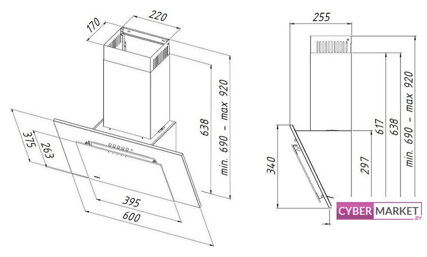 конструкция наклонная, монтаж настенный, ширина 60 см, управление кнопочное, производительность мотора 520 м³/ч, цвет черный