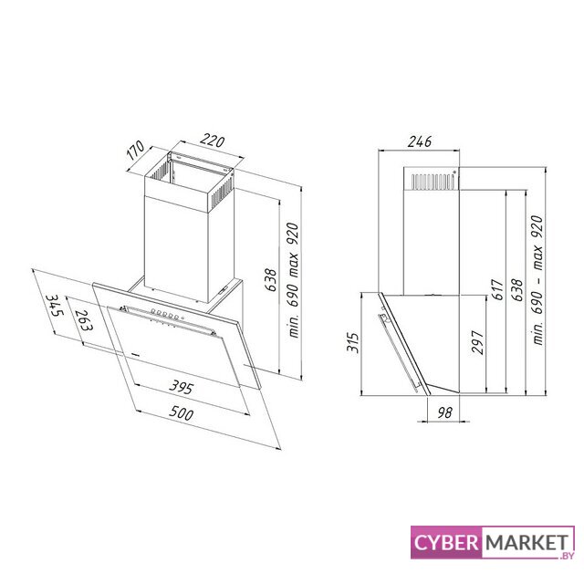 конструкция наклонная, монтаж настенный, ширина 60 см, управление механическое/кнопочное, производительность вытяжки 172 м³/ч, цвет черный