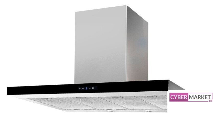 конструкция Т-образная, монтаж островной, ширина 90 см, управление сенсорное/дистанционное, производительность мотора 1250 м³/ч, цвет нержавеющая сталь/черный
