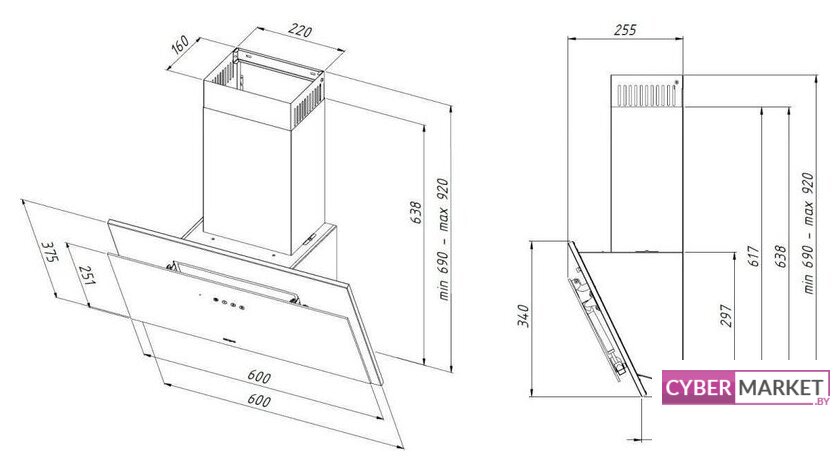 конструкция наклонная, монтаж настенный, ширина 59.8 см, управление сенсорное/дистанционное, производительность мотора 950 м³/ч, цвет черный