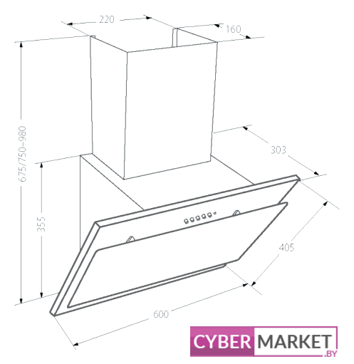 конструкция наклонная, монтаж настенный, ширина 60 см, управление кнопочное, производительность мотора 520 м³/ч, цвет черный