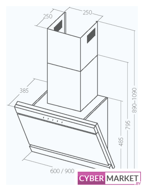 конструкция коробчатая, монтаж настенный, ширина 31 см, управление электронное/кнопочное, производительность мотора 900 м³/ч, цвет черный