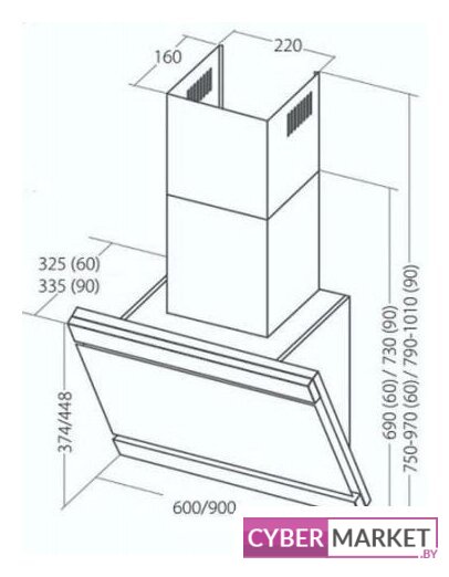 конструкция наклонная, монтаж настенный, ширина 59 см, управление механическое/кнопочное, производительность вытяжки 1000 м³/ч, цвет белый