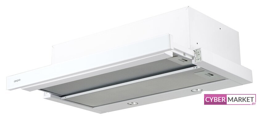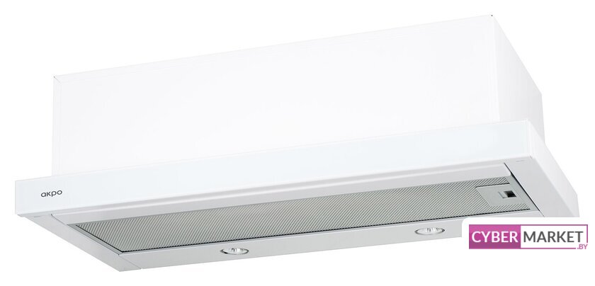 конструкция телескопическая, монтаж для встраивания, ширина 59.5 см, управление механическое/кнопочное, производительность мотора 650 м³/ч, цвет белый