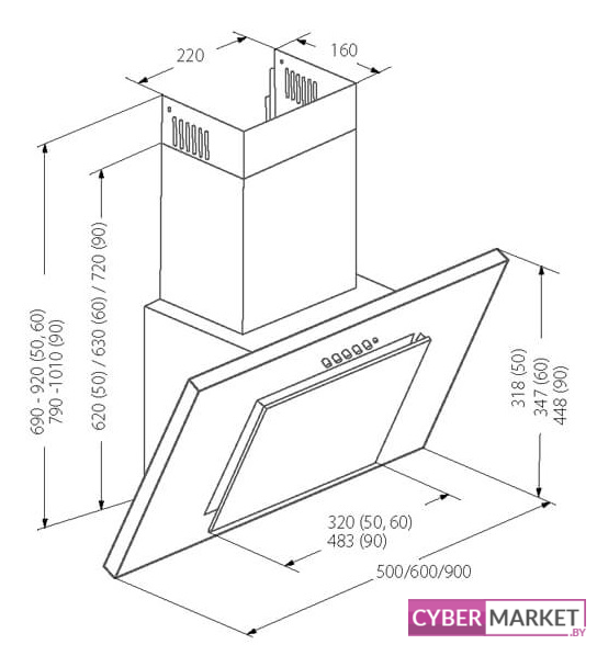 конструкция наклонная, монтаж настенный, ширина 50 см, управление кнопочное, производительность мотора 520 м³/ч, цвет черный