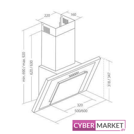 конструкция купольная, монтаж настенный, управление механическое/кнопочное, производительность мотора 400 м³/ч, ширина 50 см