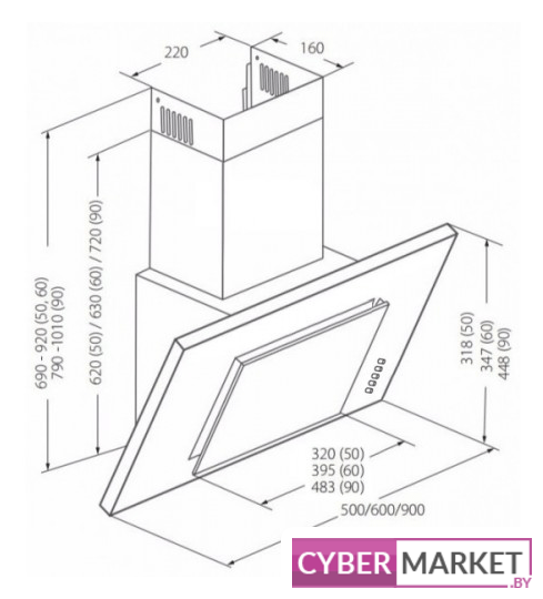 конструкция наклонная, монтаж настенный, ширина 50 см, управление механическое/кнопочное, производительность мотора 850 м³/ч, цвет черный