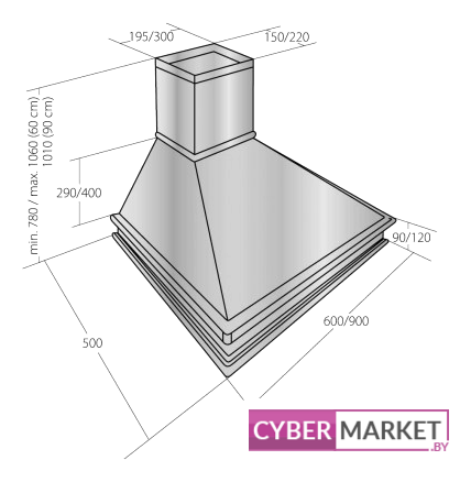конструкция наклонная, монтаж настенный, ширина 59 см, управление механическое/кнопочное, производительность вытяжки 1000 м³/ч, цвет белый
