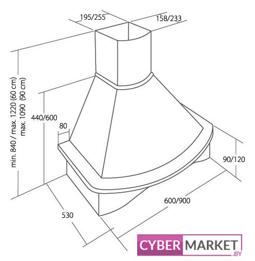 конструкция купольная, монтаж настенный, ширина 60 см, управление механическое/слайдерное, производительность мотора 850 м³/ч, цвет бежевый/белый